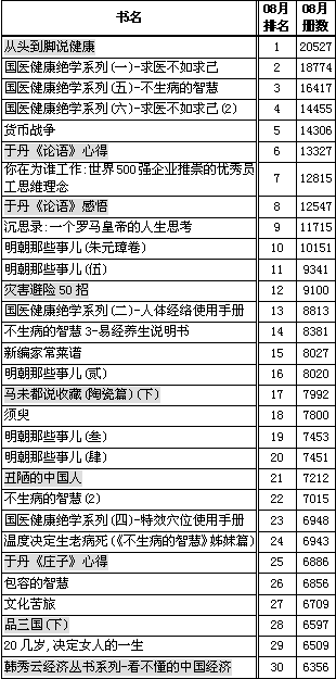 2008年8月开卷最新一期的月度排行榜(前30名)显示:
