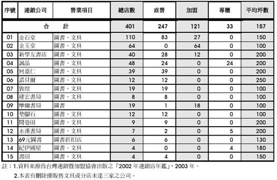 在书店经营方面亦同,近年来台湾大型连锁书店当道(表一),造成传统小书店几无生存空间,纷纷倒闭。这些大型书店同时又纷纷成立物流中心,自行扮演编辑及发行的角色,对出版社及发行商的利润空间造成挤压,地区性的小发行商面对大发行商及连锁商的竞争,经营困难;再加上便利商店的蓬勃发展,对小书店的影响更是深远。未来一般性图书的销售仍是连锁书店天下,小书店若要从中生存,必须锁定特定目标读者,以「专业书店」方式经营(如:专卖计算机书、建筑书、美术书等)。