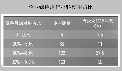 绿色原辅材料用量大幅攀升。在上年度的绿色印刷企业调查中,仅有10%~20%的绿色印刷企业表示完全使用绿色辅材。相比上年,2013年绿色印刷原辅材料的实际应用率大幅提高:163家企业表示绿色原辅材料在企业所用的各类原辅材料中占比达到80%~100%;122家企业的使用量达到50%~80%。绿色原辅材料在绿色印刷企业中的使用率实现了跨越式进步。
