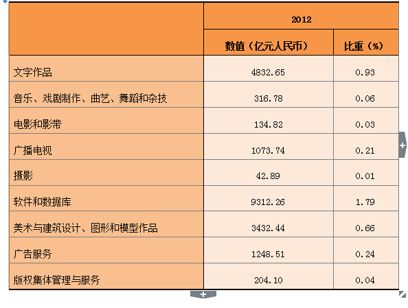 2012年,中国核心版权产业的行业增加值为20598.19亿元人民币,占全国GDP的3.97%,占全部版权产业的54.43%,是中国版权产业中最重要的产业组。在核心版权产业中,软件和数据库、新闻出版、广播影视、文化艺术等产业保持了较快增长的态势,对版权产业行业增加值的贡献较高。以新闻出版产业为例,2012年全国新闻出版产业的增加值为4617.0亿元,较2011年增加595.3亿元,增长14.8%,在核心版权产业中的经济贡献率仅次于软件和数据库,位居第二。核心版权产业各主要产业组详见下表。