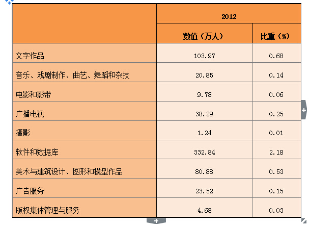 在行业增加值方面,2012年中国版权产业的行业增加值为35674.15亿元人民币,占全国GDP的6.87%,比2011年增加4145.17亿元人民币,增长率为13.15%。其中,核心版权产业的行业增加值为20598.19亿元人民币,占全国GDP的3.97%,比2011年增加3436.38亿元人民币,增长率为20.02%。