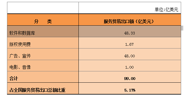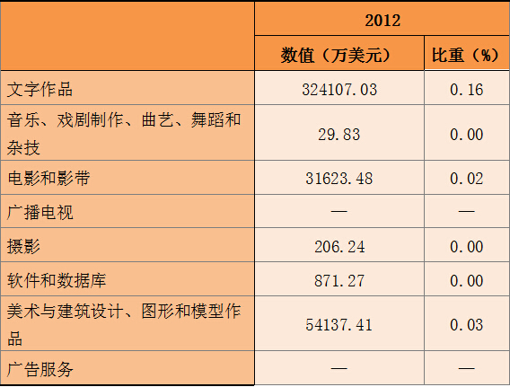 在服务贸易方面,2012年中国核心版权产业的服务贸易出口额为99.00亿美元,占全国服务贸易出口总额的5.17%。限于数据来源,仅包括软件和数据库、版权使用费、广告与宣传、电影与音像四项,其出口额分别为48.33亿美元、1.67亿美元、48.00亿美元、1.00亿美元。