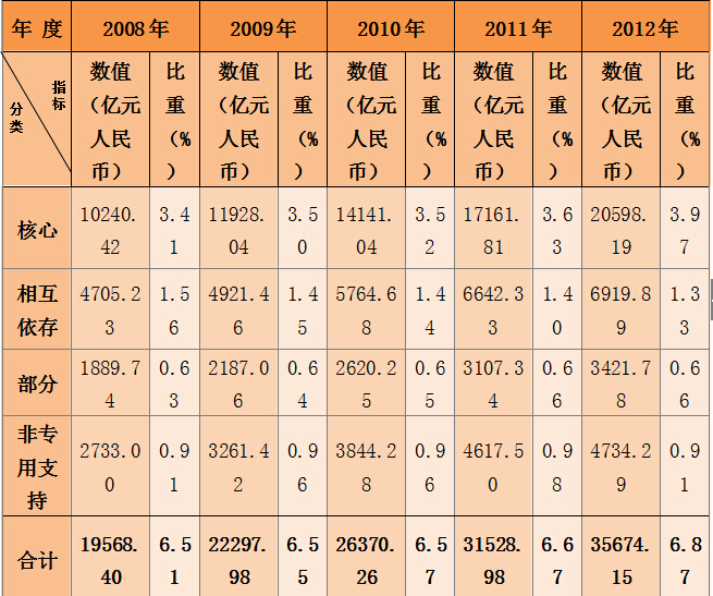 2008年中国版权产业的行业增加值为19568.40亿元人民币,占GDP的6.51%,到2012年增长到35674.15亿元人民币,占GDP的6.87%,总量增加了16105.75亿元人民币,平均年增速16.20%。2008年至2012年各年度行业增加值详见下表。