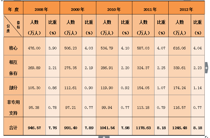 这其中,中国核心版权产业的就业人数从2008年的476.00万人、占全国城镇单位总就业人数的3.90%,增长至2012年的616.06万人、占全国城镇单位总就业人数的4.04%,总人数增加了140.06万人,平均年增速6.66%。可以看出,中国核心版权产业对全部版权产业的就业贡献最大。