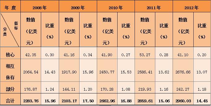 其中,相互依存的版权产业商品出口额贡献最大,占全部版权产业商品出口额的比重在90%以上,从2008年的2064.54亿美元增长至2012年的2676.66亿美元,五年间增加了612.12亿美元,平均年增长率6.71%。说明中国版权产业的商品出口仍以制造业为主。