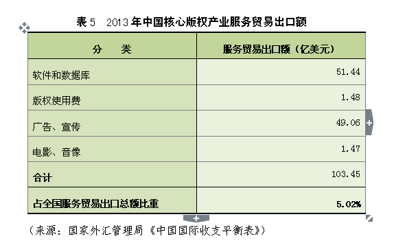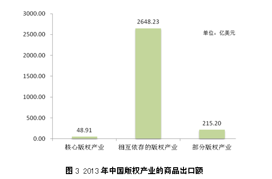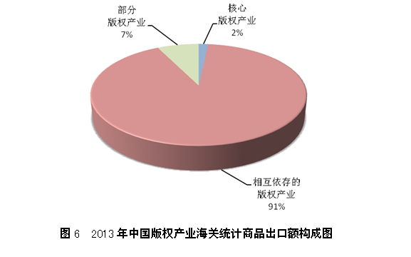 2013年中国核心版权产业的海关统计商品出口额为48.91亿美元,占全国出口总额的0.22%,占全部版权产业的2%。