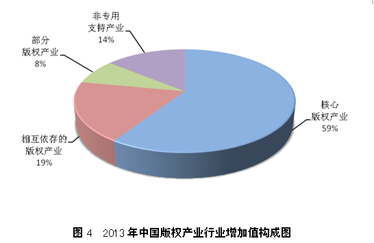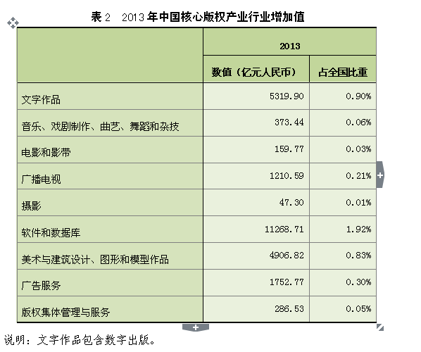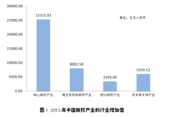 2013年,中国核心版权产业的行业增加值为25325.83亿元人民币,占全国GDP的4.31%,占全部版权产业的59%,是中国版权产业最重要的组成部分。在核心版权产业中,软件和数据库、新闻出版、广播影视、文化艺术等产业保持了较快增长的态势,对版权产业行业增加值的贡献较高。
