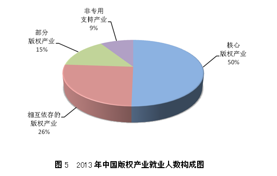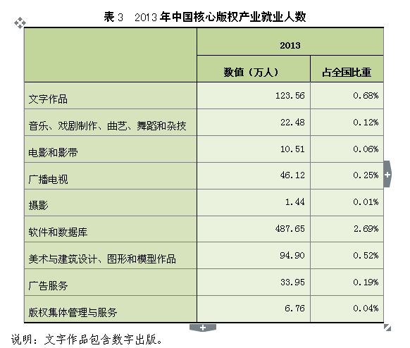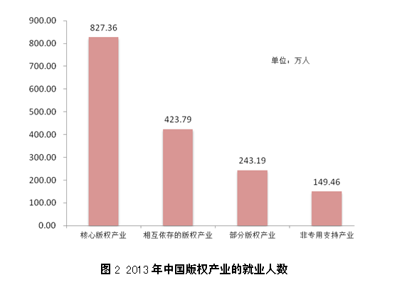 2013年,中国核心版权产业的城镇单位就业人数为827.36万人,占全国城镇单位就业总人数的4.57%,占全部版权产业的50%。在核心版权产业中,软件和数据库、新闻出版、广播影视、文化艺术等产业保持了较快增长的态势,对版权产业就业人数的贡献较高。