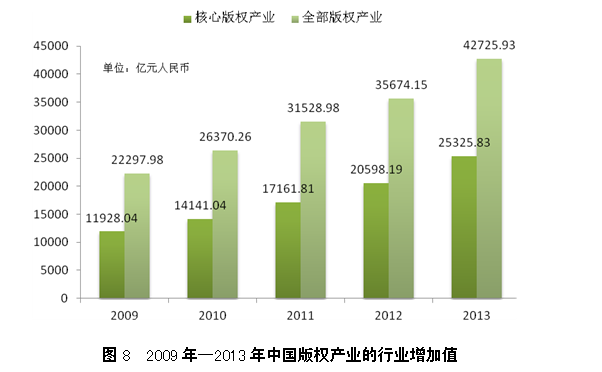 2013年中国版权产业的行业增加值为42725.93亿元人民币,比2012年增加7051.78亿元人民币,增长率为20%,比2009年至2013年五年年均增长率高2个百分点。