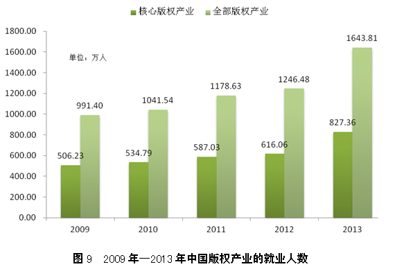 2013年,中国版权产业的城镇单位就业人数为1643.81万人,占全国城镇单位就业总人数的9.08%,比2012年增长了397.33 万人,增长率为32%。其中,核心版权产业827.36万人,占全国城镇单位就业总人数的4.57%,比2012年增长了211.30 万人,增长率为34%。