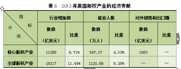 该调研报告的数据显示,2013年美国版权产业的行业增加值为19217亿美元,占美国GDP的11.44%,其中核心版权产业的行业增加值为11266亿美元,占美国GDP的6.71%。2013年,美国版权产业的行业增加值超过建筑行业(6114亿美元)、健康和社会援助行业(12009亿美元)、金融和保险行业(11146亿美元)等许多其他部门行业。