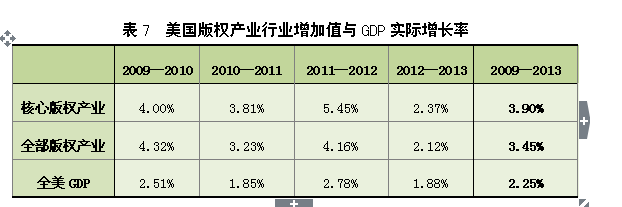 实际上,美国版权产业一直在美国经济中发挥着重要作用,其行业增加值的实际增长率一直远高于全美GDP的实际增长率。2009年至2013年美国GDP的实际增长率为2.25%,而同期美国版权产业及核心版权产业的行业增加值实际增长率分别为3.45%和3.90%,且各年度实际增长率均高于同年度GDP的实际增长率。