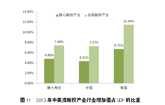 根据上述报告的数据,2013年美国版权产业的行业增加值为19217亿美元,占GDP的11.44%,其中核心版权产业的行业增加值为11266亿美元,占GDP的6.71%。2013年澳大利亚版权产业的行业增加值为1125.66亿澳元(约合818亿美元),占全国GDP的7.4%,其中核心版权产业的行业增加值为732.08亿澳元(约合532亿美元),占全国GDP的4.8%。