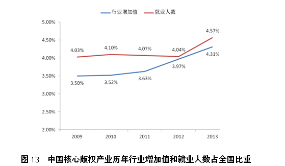 研究结果表明,2009年至2013年五年间,中国版权产业对国民经济的贡献一直保持平稳增长态势,行业增加值、城镇单位就业人数连年递增,其中2012年至2013年增速明显加快。