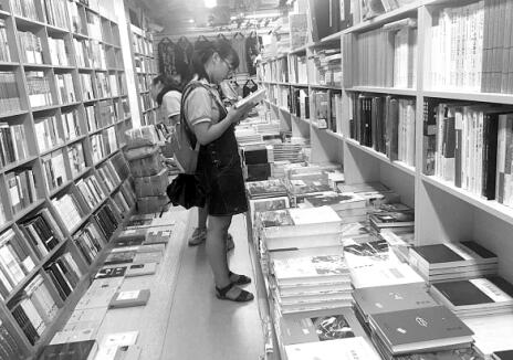 书柜上从左到右分别以“国学”“中国文学”“外国文学”“经管”等标签分类。靠近收银台旁,一些封面奇特的艺术类、科普类书籍依次摆放。这里的书偏哲学、历史、文学及学术类,老师、学者、学生是主要客源,开在校园里其实是最好的选择。