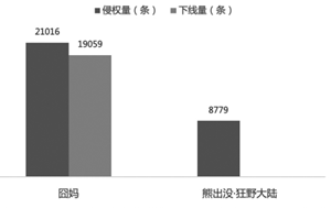 根据12426版权监测中心监测数据,截至2月12日,《囧妈》《熊出没·狂野大陆》两部影片累计监测到网络侵权链接2.98万条,主要来源为小网站、搜索引擎、社交网站等。其中《囧妈》共监测到侵权链接2.10万条,已下线1.91万条,下线率90.7%;《熊出没·狂野大陆》共监测到疑似侵权链接8779条。(见图1)