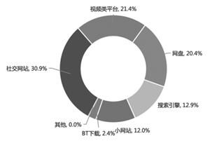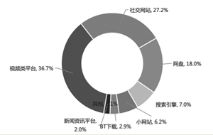 截至2020年3月11日,该剧累计监测到侵权链接8954条。从传播途径来看,云存储为主要侵权传播渠道,监测到的侵权链接占比36.2%;其次是社交网站,占比24.3%;视频类平台和搜索引擎的侵权链接占比分别为10.5%、10.3%,前四类平台合计占比81.2%。此外,小网站占比9.7%,其他类型平台占比9.1%。