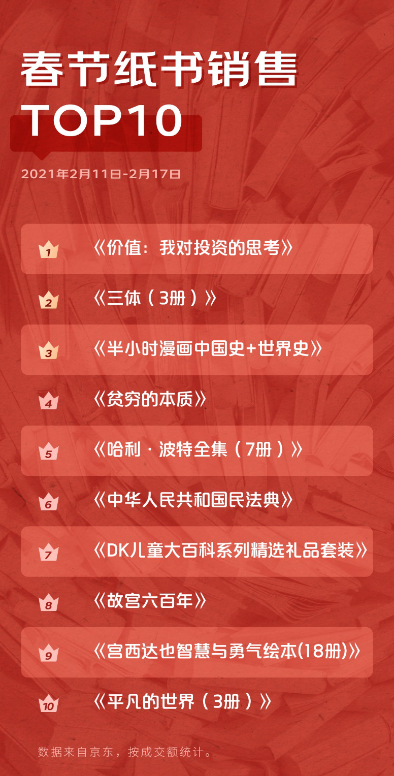 京东图书销售数据显示,春节假期间,成交额排名前五的图书品类分别是:童书、中小学教辅、小说、考试、管理。