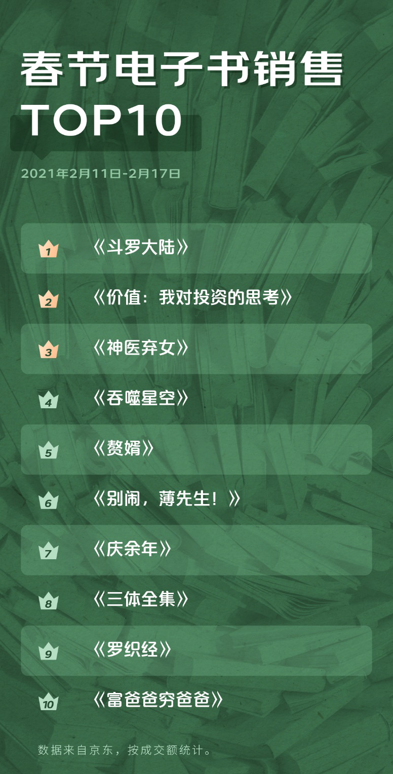 随着数字阅读市场规模的不断扩大,越来越多的读者选择看电子书。春节七天,读者购买了哪些电子书?