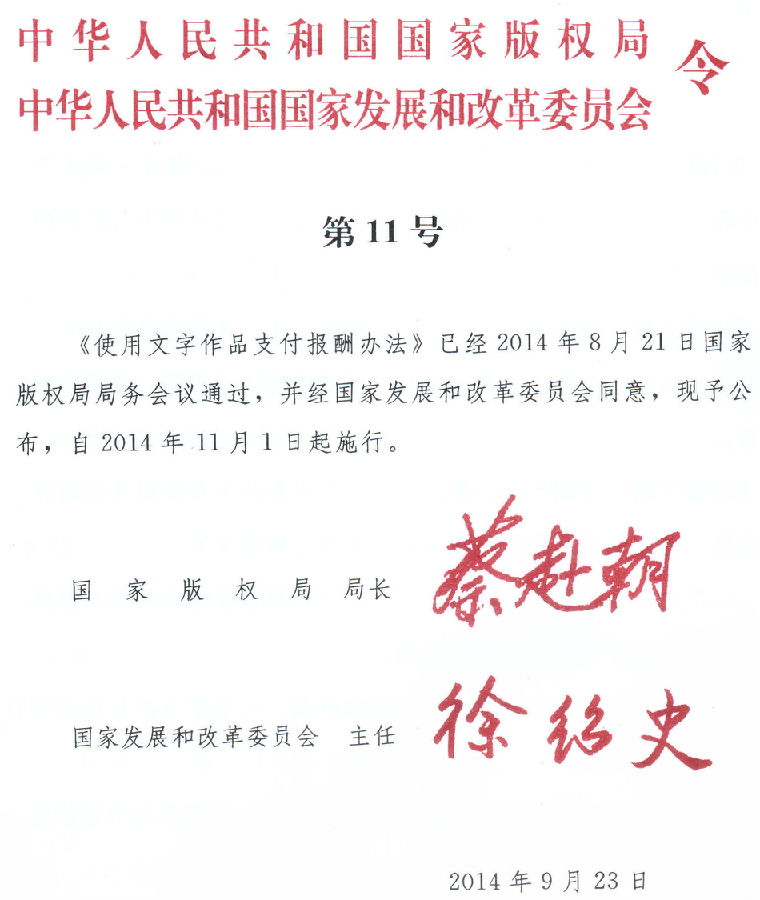 第十七条 本办法自2014年11月1日起施行。国家版权局1999年4月5日发布的《出版文字作品报酬规定》同时废止。