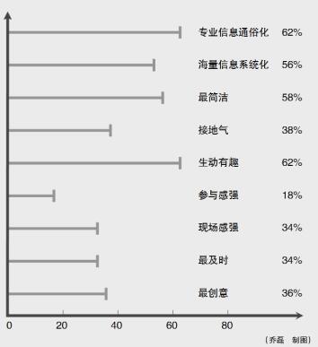 这些融媒体报道受关注的原因调查也佐证了以上分析。在专业信息通俗化、海量信息系统化、最简洁、接地气、生动有趣、参与感强、现场感强、最及时、最创意9个选项中,专业信息通俗化和生动有趣以62%并列“第一梯队”,最简洁和海量信息系统化分别以58%、56%的比例成为“第二梯队”。