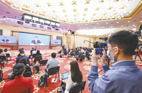 全国政协十三届三次会议新闻发布会在京举行,大会新闻发言人郭卫民介绍本次大会有关情况并回答中外记者提问。按照大会疫情防控工作要求,新闻发布会采用网络视频方式举行。图为记者在分会场参加发布会。