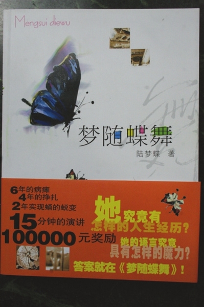 陆梦蝶说,通过读书她走出农村,通过看书她战胜磨难,写书则让她找到生活的坐标。从第一篇小故事《小凤仙》见报后,陆梦蝶的创作之路便“一发不可收拾”:2006年,自传性散文集《梦随蝶舞》出版;2009年4月30日出版《偶是农民》;同年10月出版《水晶绿》。这些文字所凝聚的,有陆梦蝶的坚强和智慧,也有她对生活的赞美与热爱。“7岁开始养成的读书习惯伴随我走过了30载春秋。尤其是在人生迷惘的时候,看看积极向上的好书,总能引导人们走出困境,找到未来。从这个意义上说,读书让我受益无穷。对每一个人而言,同样适用。”