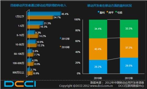 据艾媒咨询最新的统计数字(来源),有收入的个人开发者(团队)产品收益金额72.9%通过广告获得,而机构(企业)开发者则获利主要途径为游戏和广告,各占60.2%和27.7%.而无论是个人开发者还是机构开发者,无论是IOS 还是安卓平台,通过付费下载获得收入的比例不高,并且有逐步减少的趋势,这一现象在安卓平台尤其显著。同时,在这100万的手机应用开发大军中,实现盈利的仅占13.7%,主要以依附企业本身(如腾讯公司的开发者)或者个人研发应用产品继受广告获利为主;亏损的占64.5 %,持平的为21.8%.开发者的盈利状况非常不理想,即使应用前景乐观,但现在如何生存下来是首要问题。