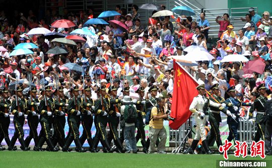 庆祝香港回归祖国15周年大汇演7月1日早上在大球场举行,解放军驻港部队三军仪仗队进场。中新社发 谭达明 摄