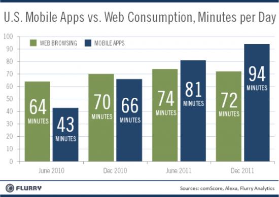 统计的结果也验证了这件事情,在Mobile Internet 发展较快的美国,根据Flurry 公布的数据,到了2011年底,人们每天已经花超过1.5小时在Mobile Apps 上面,较2010年同期成长42.4%。但同时间花在Web 上面的注意力,却只从70分钟成长到72分钟。Apps 已经是Web 的1.3倍,而这个差距还在拉大当中。