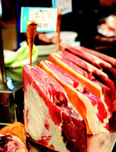 然后是正题,小小一个角落的腌腊柜台,经常挤也挤不进去,一边称金币巧克力,一边眼睛角就要瞄着了,人稍微少点,就赶紧跑过去。整只头金华火腿拎伐动,小辈也常喊吃不消,可是平时叫伊去超市,买回来真空包装的火腿,明明只有咸味没有香味,当它咸肉烧冬瓜汤,小辈还是喝得饭碗翻过来。老人家想好了,反正生活条件好了,这次专门挑“上方”买。切好的挑不中意,反正老户头,师傅有数,马上拿只整的过来,“三签香”的特级货色,还没来得及叮嘱伊一句“骨头小点”,师傅手起刀落,倒也是整整齐齐,卖相蛮好,“老师傅,今年蛮买得下手的吗。”老人家笑笑,“回去烧蜜汁火方。”