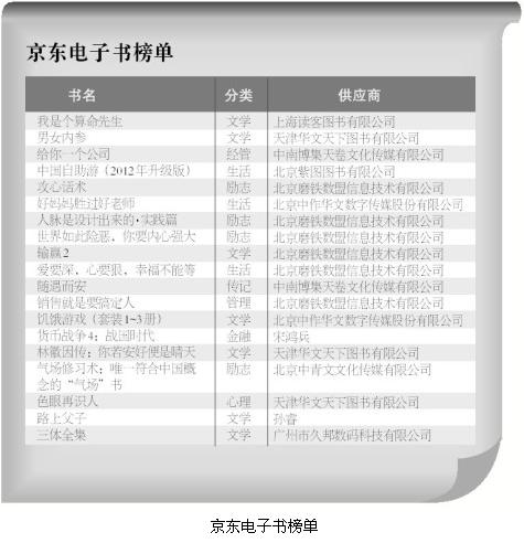 在京东电子书TOP20榜单上,今年出版的新书占了50%,且销售排名靠前。《我是个算命先生》、《男女内参》占据头两名位置,《世界如此险恶,你要内心强大》、《输赢2》、《爱要深,心要狠,幸福不能等》、《饥饿游戏(套装1~3册)》等也基本在10名左右的位置。榜单反映出读者在电子阅读上更爱“尝鲜”,这也与电子阅读的便利、便捷性相符合。