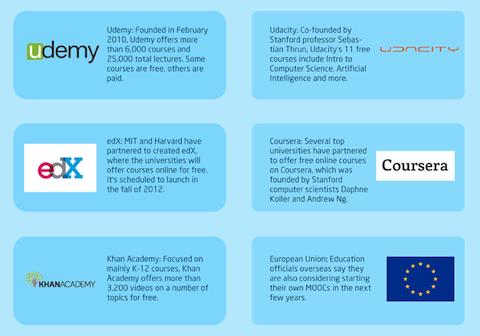 这一波浪潮开始于2011年的秋天,时任斯坦福大学教授的Sebastian Thrun 在线开设了一门人工智能的课程,这一课程面向全球所有人开放且完全免费,最终有16万人注册参与了这门课程的学习,在这一课程中,学生们建立起了Facebook 群组,在其中针对课程内容进行在线讨论,甚至有志愿者将这一课程翻译成了44种语言,让更多国家的人能够得以受益,这让MOOC 模式与最传统的、将课程视频简单上传到互联网上的模式区分开来。这一课程在业界激起了广泛的赞扬,在次之后Thrun 在2012年1月创立了Udacity,目前为学生提供数十门开放课程,范围主要在计算机编程和软件设计领域,Udacity 表示,自己目前拥有73.9万学生。而在四月份,另一家类似的新创公司Coursera 创立,其同样也是由两名斯坦福计算机学教授安德鲁和达芬·科勒尔创立,其目前已经拥有包括斯坦福大学、密歇根大学、宾夕法尼亚大学、普林斯顿大学等的课程支持,范围包括数学、科学和人文等,目前其宣称自己已有100万注册学生数。而edX 更是直接由哈佛大学和MIT 联合创办,尝试类似的互联网教育模式。