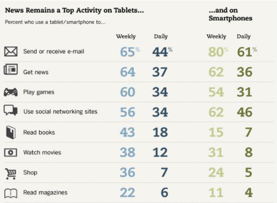 新闻仍在移动设备用途中扮演重要的角色。64% 的平板用户和 62% 的智能手机用户使用移动设备获知新闻。新闻阅读在平板电脑用户中的使用率和收发邮件、打游戏几乎一样高,而智能手机用户更倾向于用设备收发邮件,其次是获知新闻。