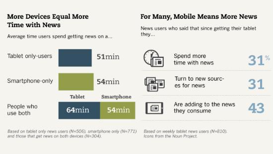 更多设备意味着人们会花更多时间阅读新闻。只有平板电脑的用户每天阅读新闻的时间为51分钟,而只有智能手机的用户每天阅读新闻的时间为54分钟,同时拥有两种设备的用户阅读新闻的时间为64分钟+54分钟=128分钟。对许多用户来说,移动设备意味着更多新闻:更多时间和更多新闻源。