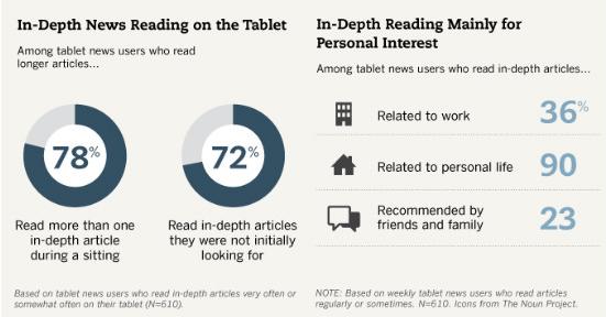 在内容方面,人们更喜欢看跟个人生活相关的报道,其次是跟工作有关的,朋友和家人推荐的文章占23%。坐着使人看更多长篇报道。在使用平板电脑阅读深度报道的用户中,78%表示坐着时能阅读超过一篇深度报道。人们阅读长文章的动机也是不明确的:72%的用户表示一开始并没打算看深度报道。