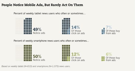 移动设备新闻的广告也不起眼,不到一半的用户会注意到它们,进行点击及购买的不到 10%。网上交易类的广告很难达到目的,传递信息或者增强品牌更有效。