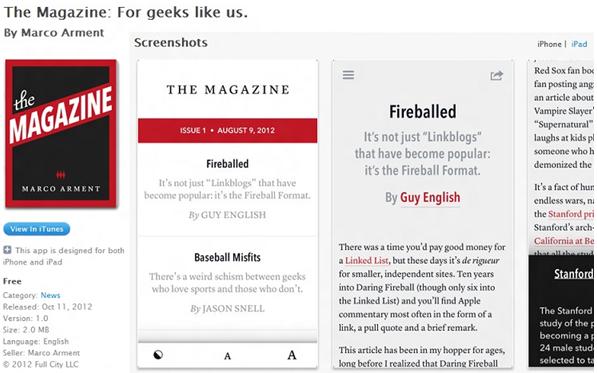 在The Magazine 上,两周只有4篇文章,订阅用户每月需支付2块钱,而且软件只支持iOS 6系统(未来也不会支持Android)。同时和Instapaper一样,The Magazine 也是Arment一个人在做,没有融资和其他员工。