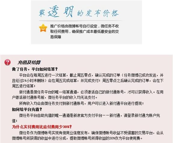 Update:根据微博用户所_谓理想叫亚洲提醒,微任务“作为微博帐号实现有偿商业信息发布,确保微博帐号收益不受侵害的交易平台,会从微博帐号所获得的收益中进行分成,提取微博帐号所得收益的30%作为平台使用费。”此前,微任务在其宣传页面称微任务不收取任何费用。